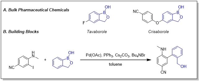 Special [c][1,2]oxaborol-1(3H)-ols such as Tavaborole and Crisaborole are BPC. Tavaborole is an antifungal agent that protects against trichophyton and is effective in treating onychomycosis while Tavaborole is a non-steroidal phosphodiesterase 4 (PDE-4) inhibitor. They can also be building blocks used to induce 2-benzyl alcohol group.