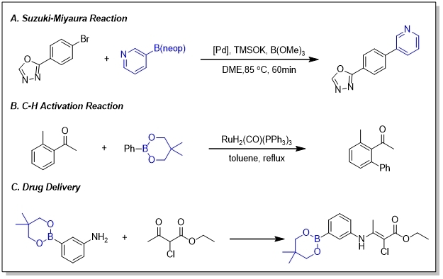 Bneops can be used in heteroaryl−heteroaryl SM cross-coupling reaction and C-H activation reaction. Also, due to the good water and fat solubility, they can be applicated for drug delivery. Bis[(-)-pinanediolato]diboron is a chiral reactant and both catalyst.