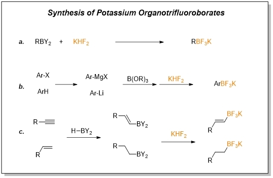 Organotrifluoroborates can be synthesized by a variety of methods, including (a) Trisubstituted organoborons can be converted to related organotrifluoroborates on treatment with KHF2; (b) Lithium-halogen exchange or magnesium insertion followed by boronation and hydrolysis furnished crude boronic acid, which, on treatment with KHF2, gave aryltrifluoroborates; (c) The alkenes or alkynes undergo hydroboration and then react with KHF2 to convert to organotrifluoroborates.