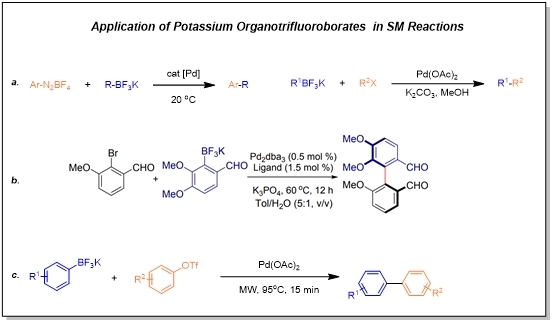 In 1996, the Genet group reported the application of potassium organotrifluoroborates as a nucleophile in SM coupling reactions, gradually attracting the interest of researchers. Subsequent reports include ligand-involved coupling and microwave heating promotion applications. Organotrifluoroborates can overcome some shortcomings of boronic acids and esters and are becoming ideal and promising organoboron nucleophiles.