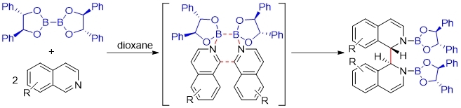 The application of diboron in organic synthesis has opened a new era with the report of metal-free diborylation of non-activated olefin. Varies mechanisms were proposed including heterolytic cleavage, hemolytic cleavage as well as concerted reaction. In 2017, Tang group reported a chiral diboron-templated highly diastereoselective reductive coupling of isoquinolines that provided expedited access to a series of chiral substituted bisisoquinolines. Mechanistic investigation suggests the reaction proceeds through a concerted [3,3]-sigmatropic rearrangement.