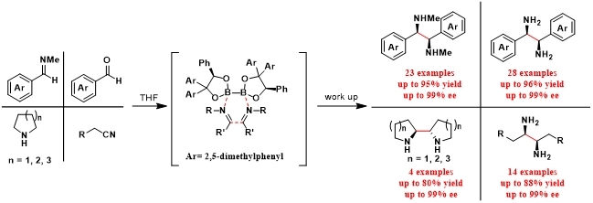 In 2017, Tang group reported a general, practical, and highly efficient method for asymmetric synthesis of a wide range of chiral vicinal diamines via reductive coupling of imines templated by chiral diboron.