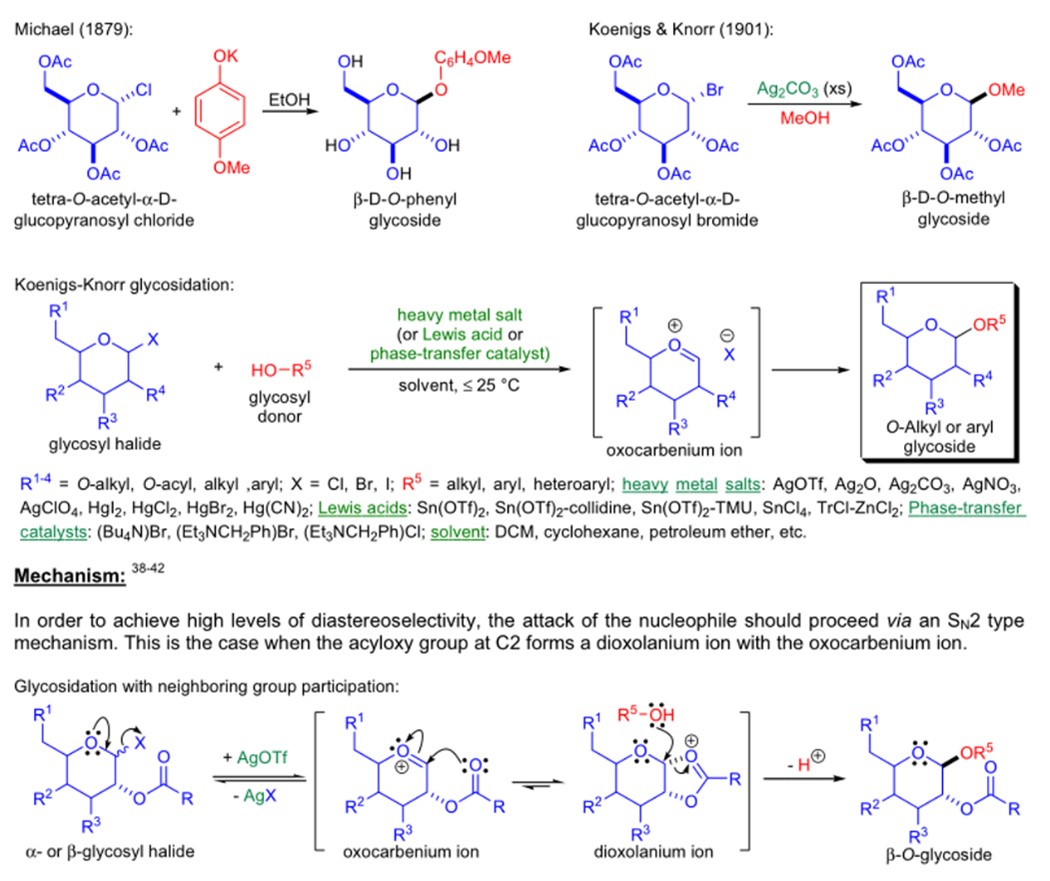 The synthesis of glycosides by using glycosyl halides and strong bases was first reported by A. Michael in 1879. Dozens of years after, 1901, W. Koenigs and E. Knorr improved this reaction through heavy metal salts or Lewis acids. It is widely used in the synthesis of glycosides with complex groups attached to anomeric carbon atoms, especially oligosaccharides (Fig.1). 1 2The reaction ratio of α/β is determined by various factors such as steric hindrance of the substituents, catalysts, ligands, ortho Substituents, and basic properties.