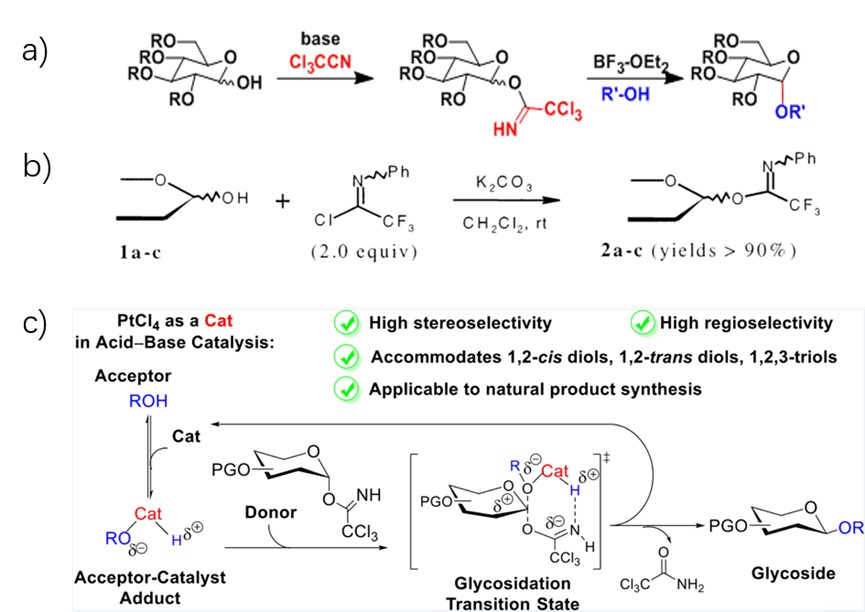 The Schmidt glycosylation is a Lewis acid-catalyzed glycosylation using glycosyl trichloroacetimidate as the donor (Fig.4a). 6 2001, Yu lab modified the reaction by using Glycosyl (N-phenyl) trifluoroacetimidates as effective glycosyl donors (Fig.4b). 7 2021, Peng lab adjusted the lewis acid to achieve stereoselective and regioselective glycosidation (Fig.4c). 8