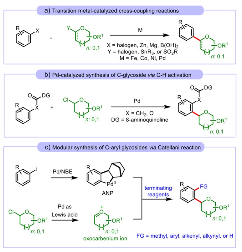 Figure 6: Glycosidation based on (a) Tsuji-Trost reaction, (b) C-H active coupling, and (c) Catellani reaction