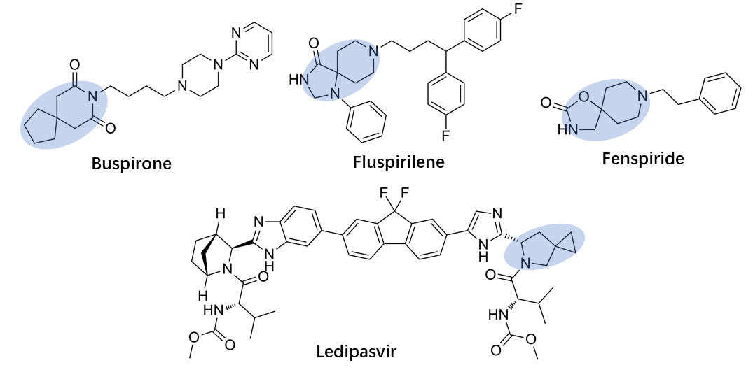 Spirocycles are ring systems in which two rings are fused by a single atom (Zheng and Tice, 2016). Spirocyclic scaffolds are widely used in medicinal chemistry, which have been paid increasing interest in by the development of modern drugs. Currently, a wide range of spirocyclic scaffolds can be recognized in drug candidates and approved drugs (Figure 1) (Hiesinger et al., 2021).