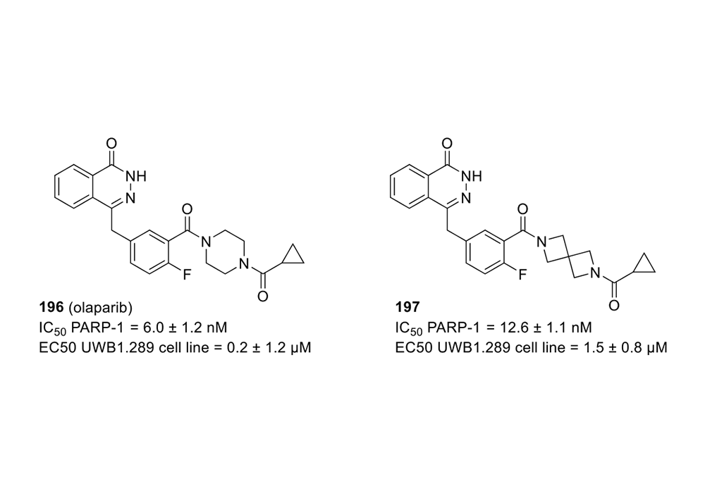 Spirocyclic scaffolds can also influence selectivity. For example, the piperazine of poly (ADP-ribose) polymerase (PARP) inhibitor, Olaparib, was substituted with diazaspiro [3.3] heptane to obtain 197. Although the spirocyclic analogue showed a 2-fold reduction in potency, the selectivity for RARP-1 against other members of the PARP family increased significantly, which came along with reduced DNA damage and cytotoxicity (Figure 5)(Reilly et al., 2018).