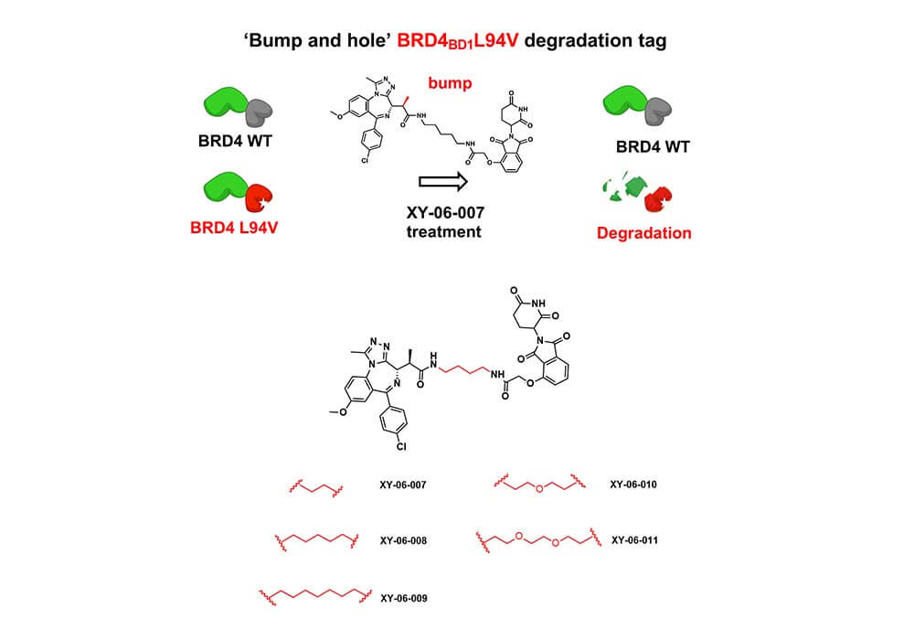 Linkers can also be used for the synthesis and development of PROTACs based on protein fusion tags. The Fischer group of Harvard Medical School reported a newly developed heterobifunctional degrader based on a "bump-and-hole" approach named XY-06-007, along with the corresponding protein degradation tag BRD4BD1L94V[3], the combination of them makes the degrader XY-06-007 more accurate and effective when targeting the substrate domain BRD4BD1L94V, which greatly reduces the off-target effect compared to the same type of other degraders. The key process of degrader XY-06-007's optimization is the selection of a suitable linker, in this work, the author tried several lengths of alkyl diethyl amine and PEG-derived linkers to connect the BET bromine domain inhibitor with the CRBN ligand to obtain a series of compounds, and finally got the most effective one: XY-06-007.