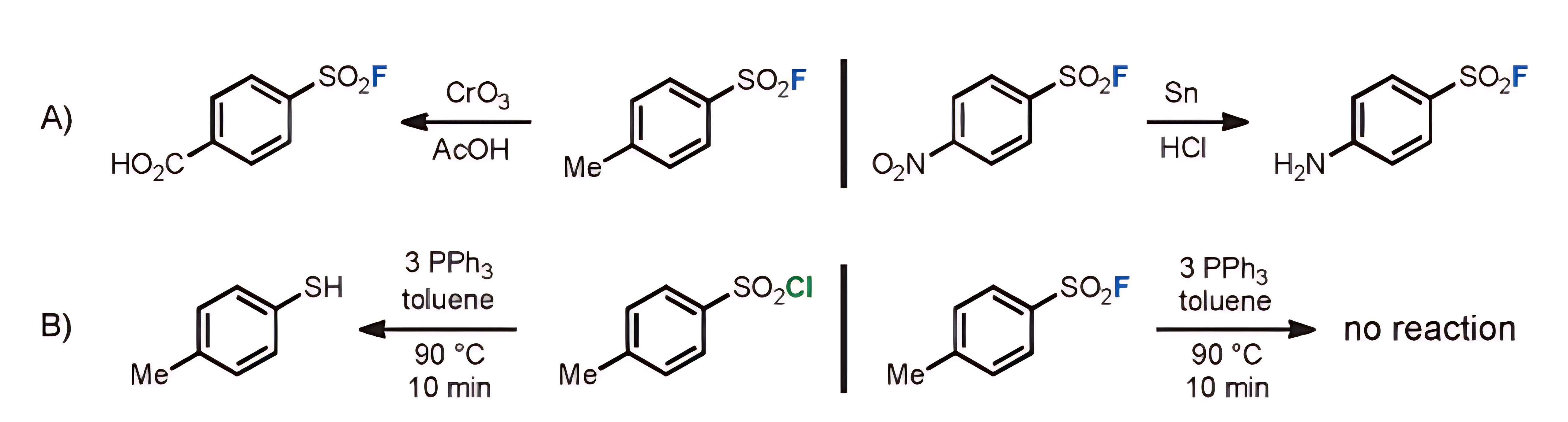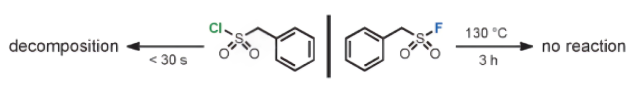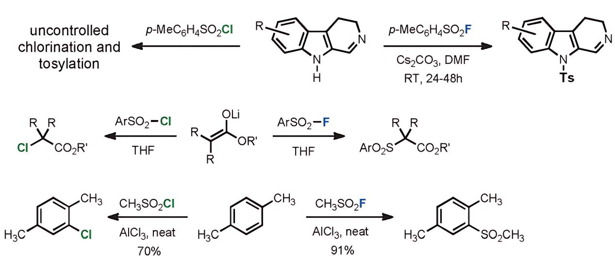 The high polarizability of the chlorine center in -SO2Cl and related groups makes it susceptible to reductive attack, which can lead to homolytic cleavage and the generation of the radical Cl·. Given its electrophilic nature, Cl· can result in chlorinated products. Consequently, reactions of -SO2Cl with carbon nucleophiles typically yield a mixture of sulfonated and chlorinated products. In contrast, sulfonyl fluorides under these circumstances produce only sulfonated outcomes. This distinctive characteristic makes sulfonyl fluorides an excellent tool for precise chemical modifications, ensuring that the desired sulfonation occurs without unwanted side reactions such as chlorination. This specificity is particularly valuable in complex synthetic scenarios where control over the reaction outcome is critical.