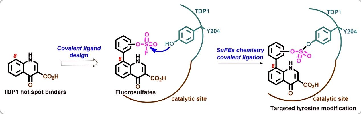 Mainstream covalent modification strategies often target cysteine (Cys), utilizing its high nucleophilicity with electrophilic reagents like maleimides and acrylamides for precise modification or inhibition. However, Cys sites are limited and some are inaccessible due to steric hindrance. Sulfonyl fluoride (SuFEx) reagents exhibit broad reactivity with various nucleophilic amino acids (such as Tyr, Lys, His, Arg, Ser, Thr), forming stable covalent bonds efficiently and selectively. In 2024, NIH research [4] utilized SuFEx technology to develop potent covalent inhibitors targeting tyrosyl-DNA phosphodiesterase 1 (TDP1). Earlier, Baker et al. [5,6] also developed multiple covalent inhibitors using SuFEx, including inhibitors of dihydrofolate reductase (DHFR), guanine deaminase (GAH), α-chymotrypsin, and fatty acid amide hydrolase (FAAH). These studies collectively demonstrate the unique value of SuFEx technology in covalent drug design.