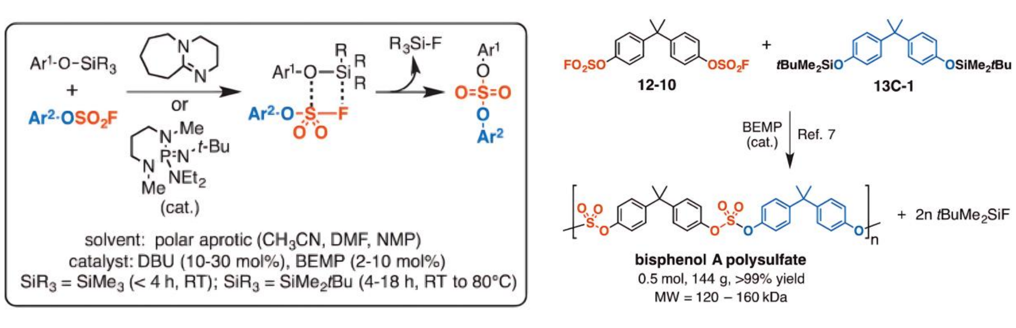 Gembus et al. reported [8] that Lewis base-catalyzed coupling reactions between silanes and sulfonyl fluorides can efficiently form stable sulfonate ester bonds with high yields. Key advantages include: 1) High selectivity, producing only inert or even volatile silicon fluoride by-products; 2) Excellent functional group compatibility, limited mainly by the steric hindrance around the silicon atom and interference from acidic protons that could quench the basic catalyst. These features make it an ideal choice for synthesizing polymeric materials, providing new approaches for the molecular design of high-performance materials.