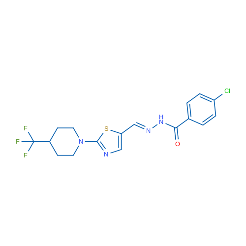 | SMILES Code: | O=C(N/N=C/C1=CN=C(N2CCC(C(F)(F)F)CC2)S1)C3=CC=C(Cl)C=C3 | ||